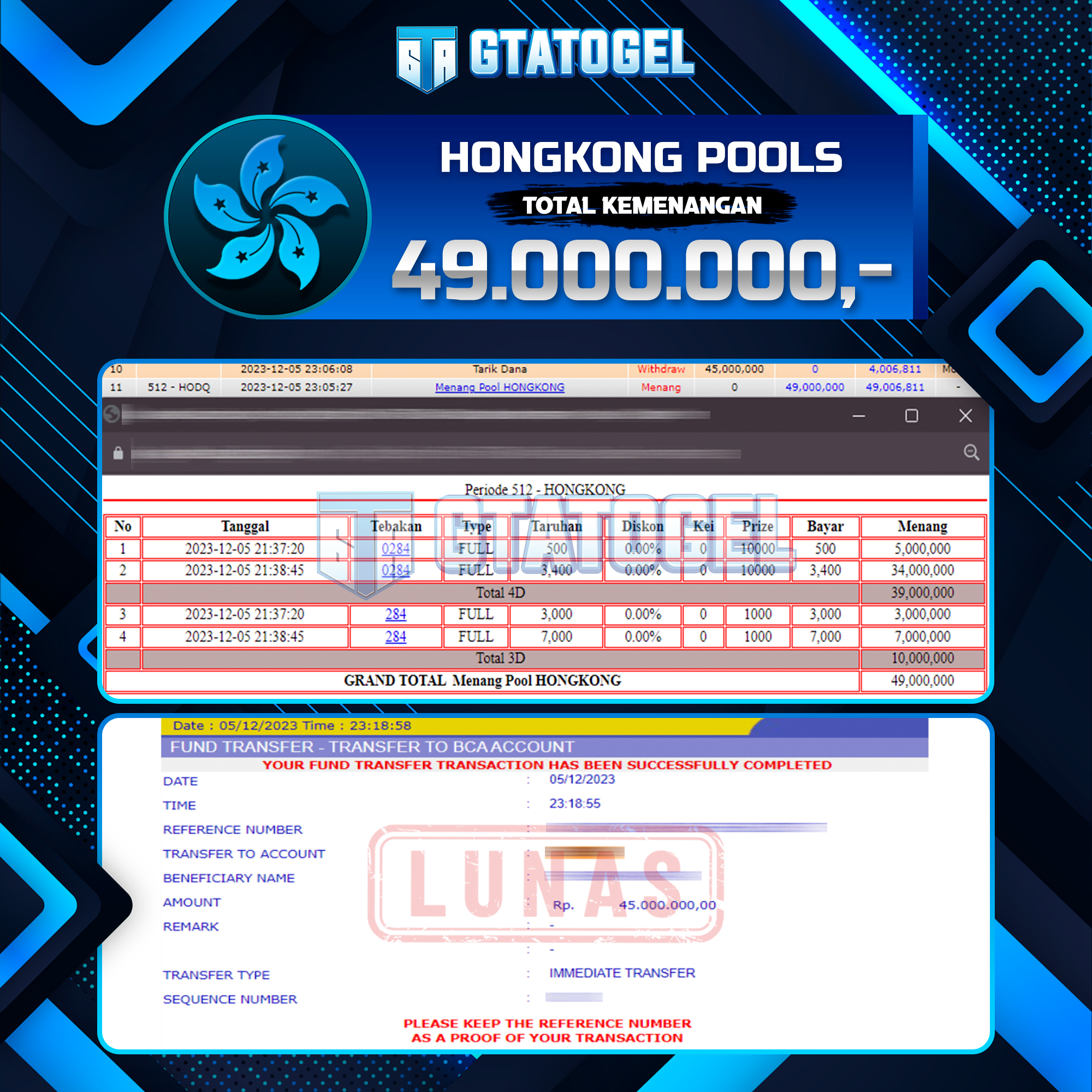 GTATOGEL – BUKTI WITHDRAW KEMENANGAN JP TOGEL HONGKONG POOLS SEBESAR Rp. 49.000.000,- DI BAYAR LUNAS !!!