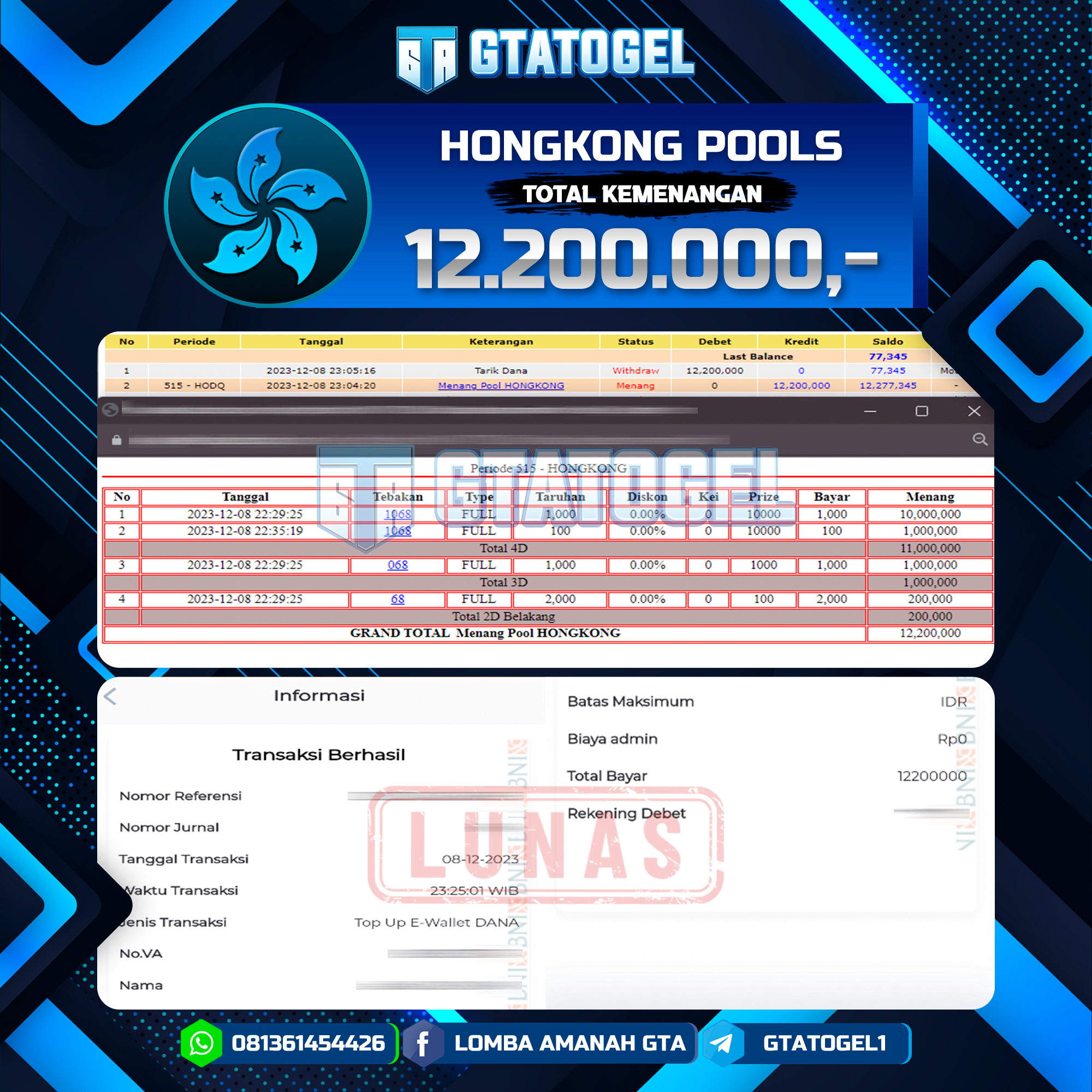 GTATOGEL – BUKTI WITHDRAW KEMENANGAN JP TOGEL HONGKONG POOLS SEBESAR Rp. 12.200.000,- DI BAYAR LUNAS !!!