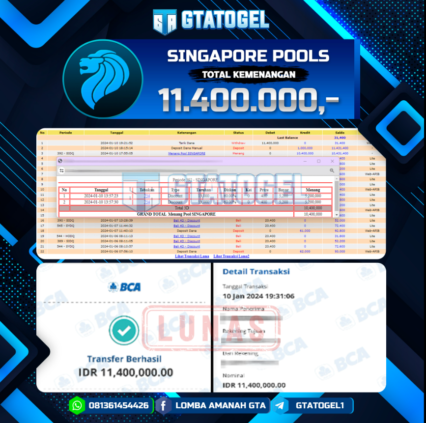 GTATOGEL – BUKTI WITHDRAW KEMENANGAN JP TOGEL SINGAPORE POOLS SEBESAR Rp. 11.400.000,- DI BAYAR LUNAS !!!