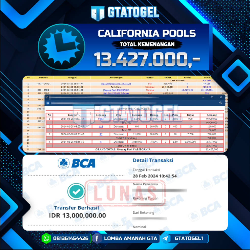 Bukti JP TOGEL Situs GTATOGEL CALIFORNIA POOLS TODAY SEBESAR Rp. 13.427.000,- DI BAYAR LUNAS !!!