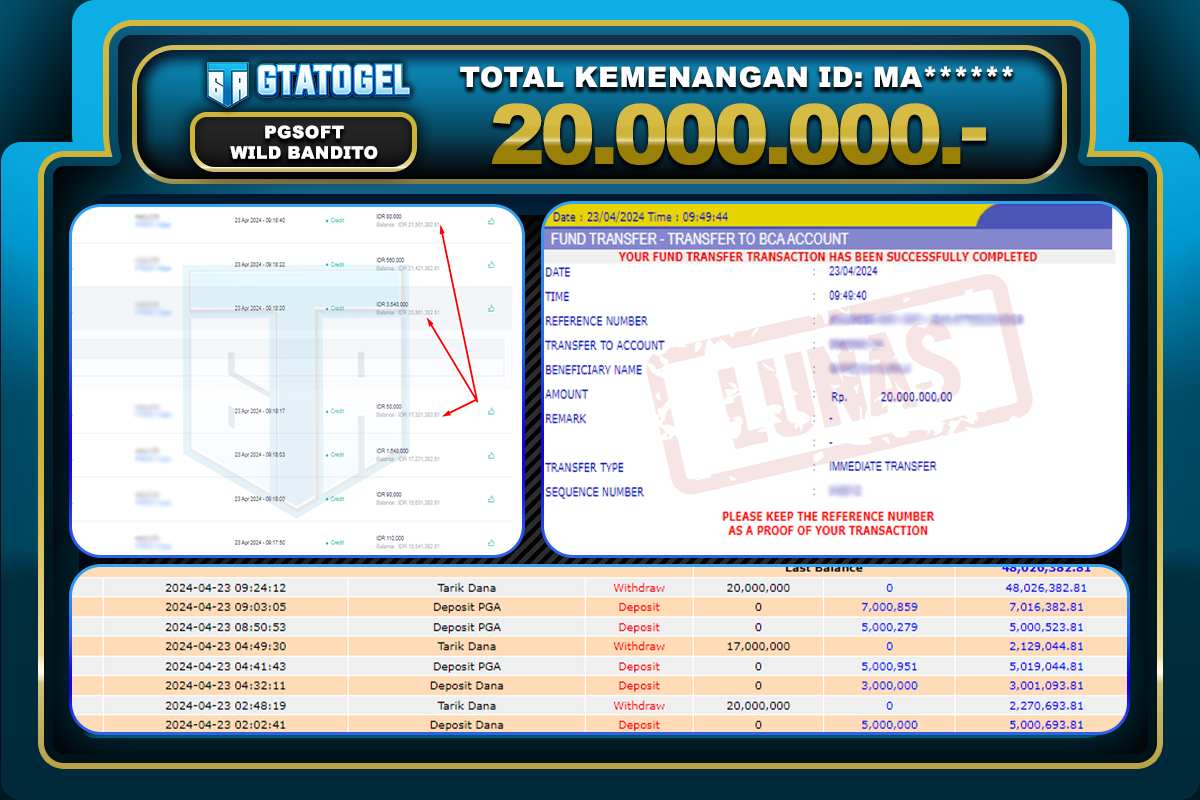 GTATOGEL – BUKTI WITHDRAW KEMENANGAN JP WILD BANDITO Rp. 20.000.000,- DI BAYAR LUNAS !!!