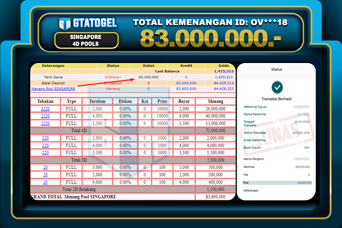 GTATOGEL – BUKTI WITHDRAW KEMENANGAN JP SINGAPORE 4D POOLS Rp. 83.000.000,- DI BAYAR LUNAS !!!