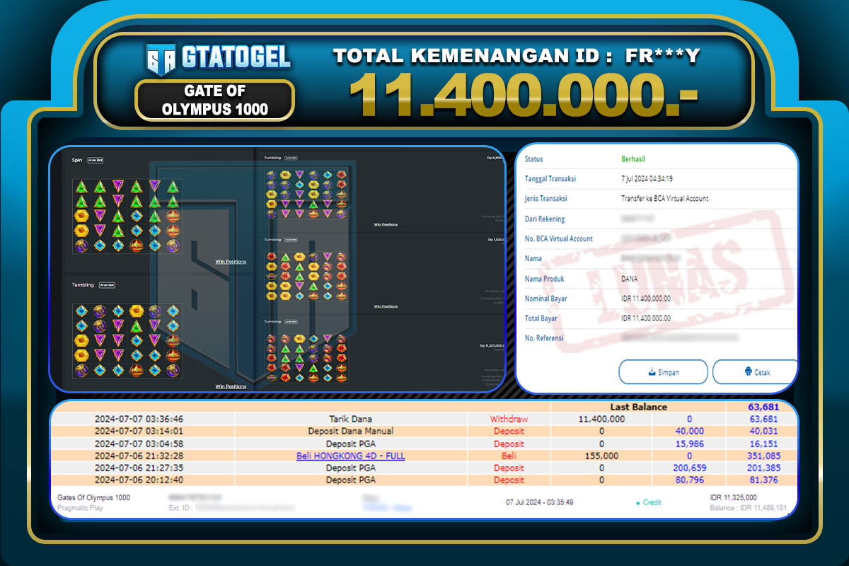 GTATOGEL – BUKTI WITHDRAW KEMENANGAN JP GATE OF OLYMPUS Rp. 11.400.000,- DI BAYAR LUNAS !!!