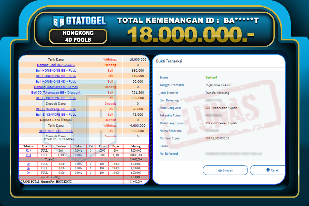 GTATOGEL – BUKTI WITHDRAW KEMENANGAN JP HONGKONG 4D POOLS Rp. 18.000.000,- DI BAYAR LUNAS !!!