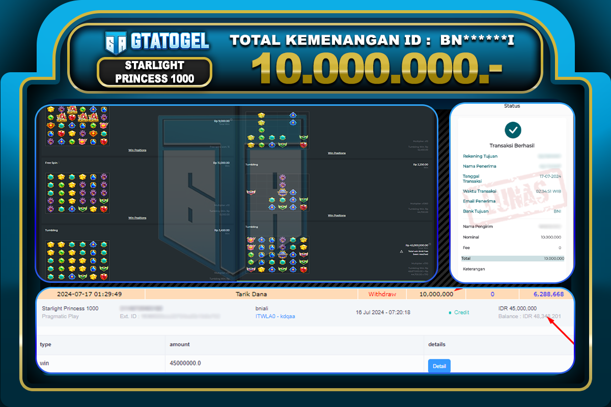 GTATOGEL – BUKTI WITHDRAW KEMENANGAN JP SLOT STARLIGHT PRINCESS 1000 SEBESAR Rp. 10.000.000,- DI BAYAR LUNAS !!!