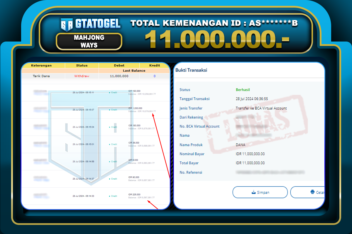 GTATOGEL – BUKTI WITHDRAW KEMENANGAN JP MAHAJONG WAYS Rp. 11.00.000,- DI BAYAR LUNAS !!!