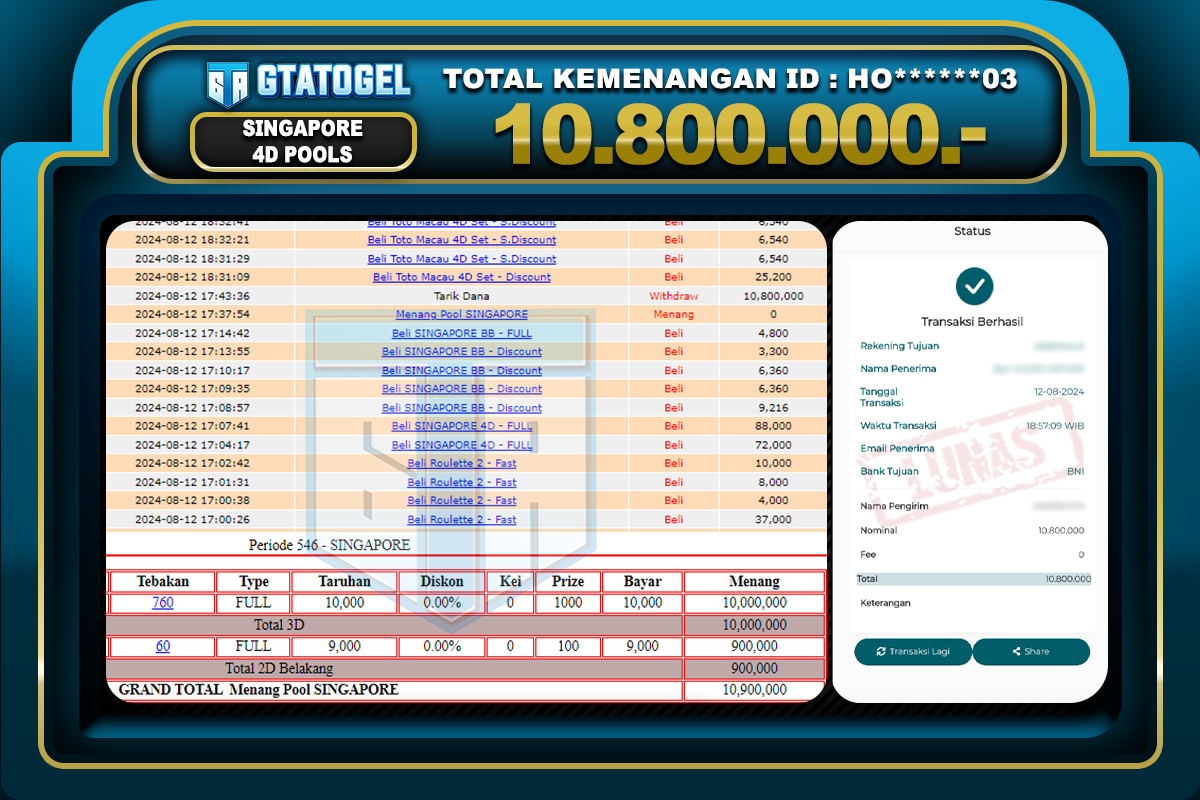 GTATOGEL – BUKTI WITHDRAW KEMENANGAN JP SINGAPORE 4D POOLS Rp. 10.800.000,- DI BAYAR LUNAS !!!