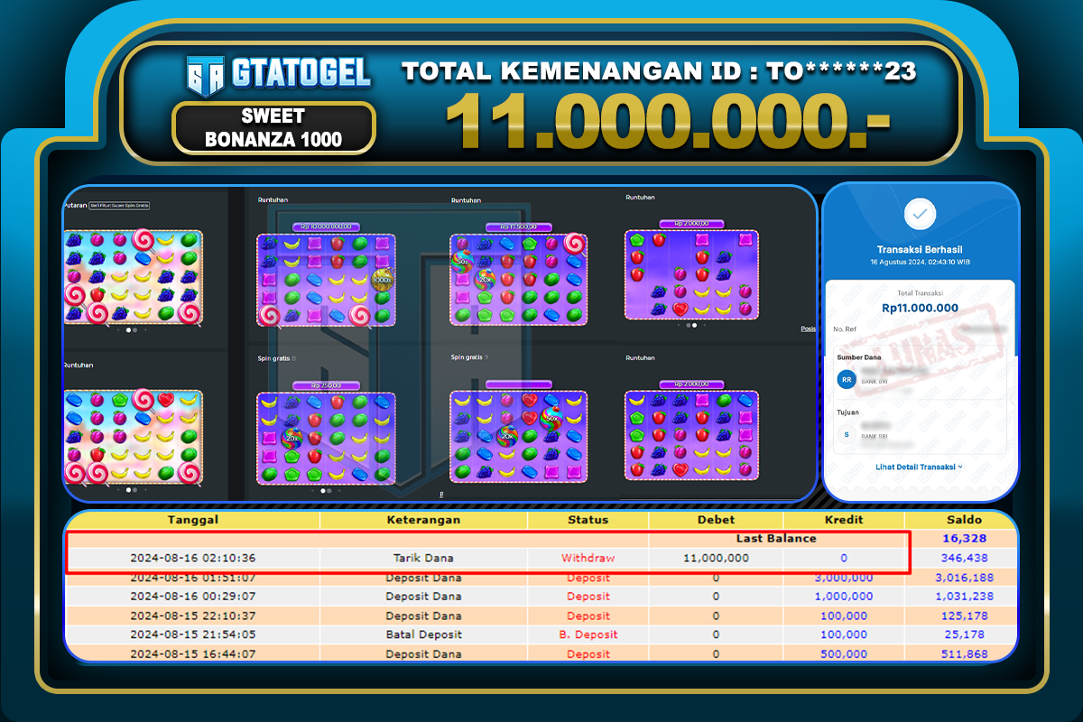GTATOGEL – BUKTI WITHDRAW KEMENANGAN JP SWEET BONANZA 1000 Rp. 11.000.000,- DI BAYAR LUNAS !!!