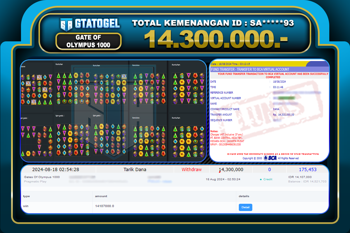 GTATOGEL – BUKTI WITHDRAW KEMENANGAN JP GATE OF OLYMPUS 1000 Rp. 14.300.000,- DI BAYAR LUNAS !!!