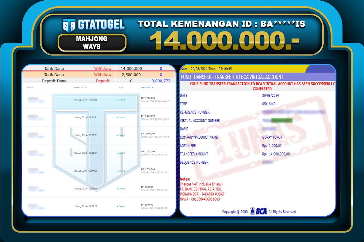 GTATOGEL – BUKTI WITHDRAW KEMENANGAN JP MAHJONG WAYS Rp. 14.000.000,- DI BAYAR LUNAS !!!
