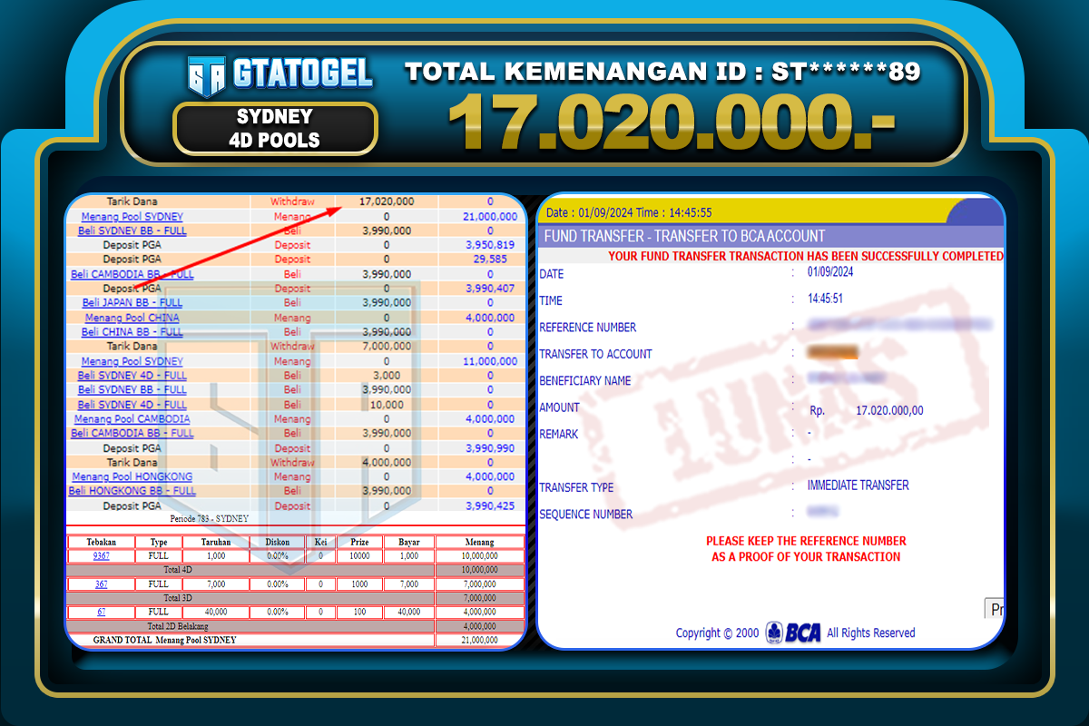 GTATOGEL – BUKTI WITHDRAW KEMENANGAN JP SYDNEY 4D POOLS Rp. 17.020.000,- DI BAYAR LUNAS !!!