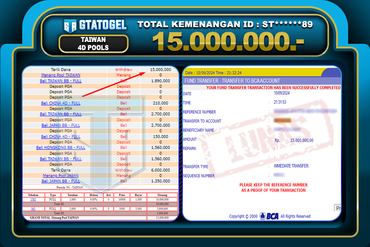 GTATOGEL – BUKTI WITHDRAW KEMENANGAN JP TAIWAN 4D POOLS Rp. 15.000.000,- DI BAYAR LUNAS !!!