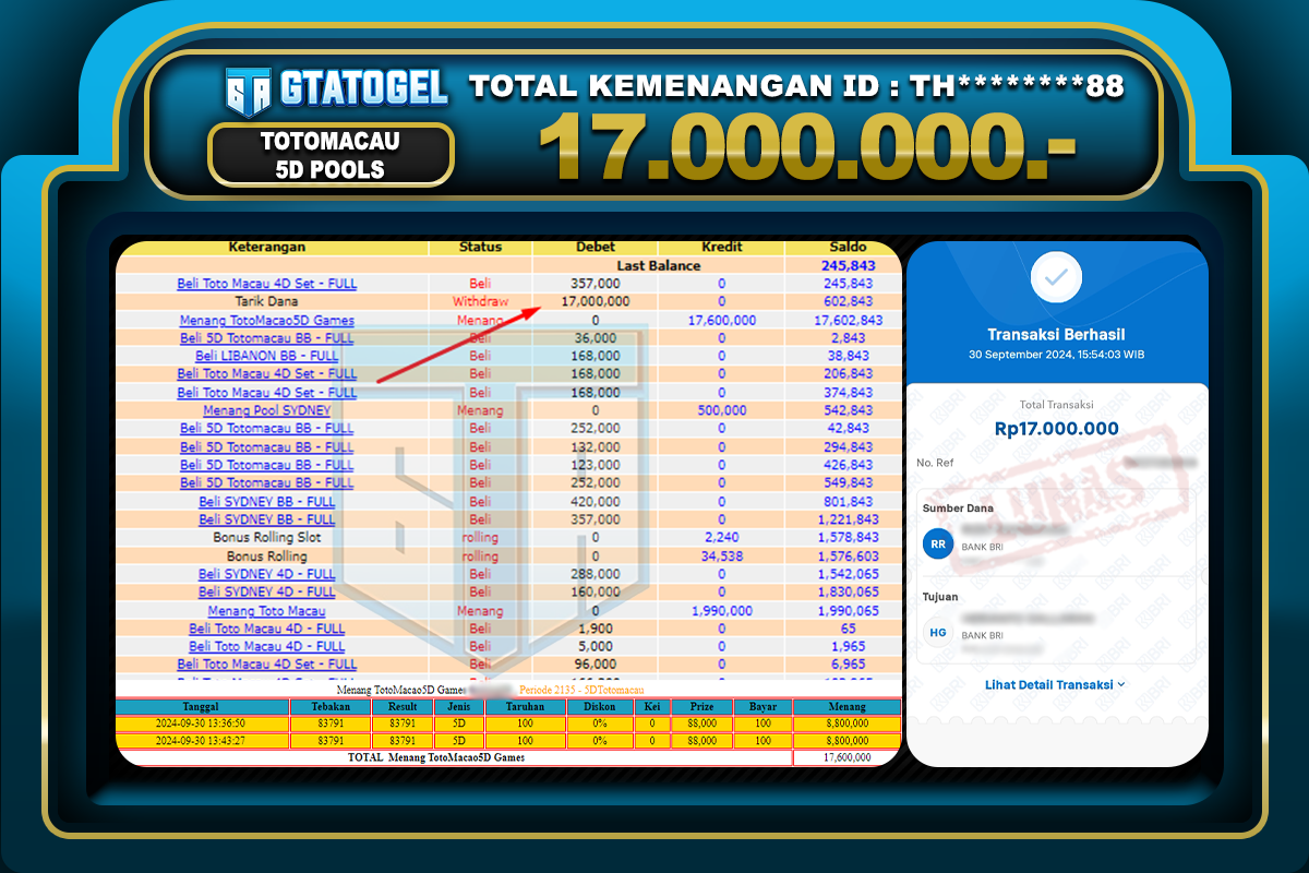 GTATOGEL – BUKTI WITHDRAW KEMENANGAN JP OTOMACAU 5D POOLSRp.17.000.000,- DI BAYAR LUNAS !!!
