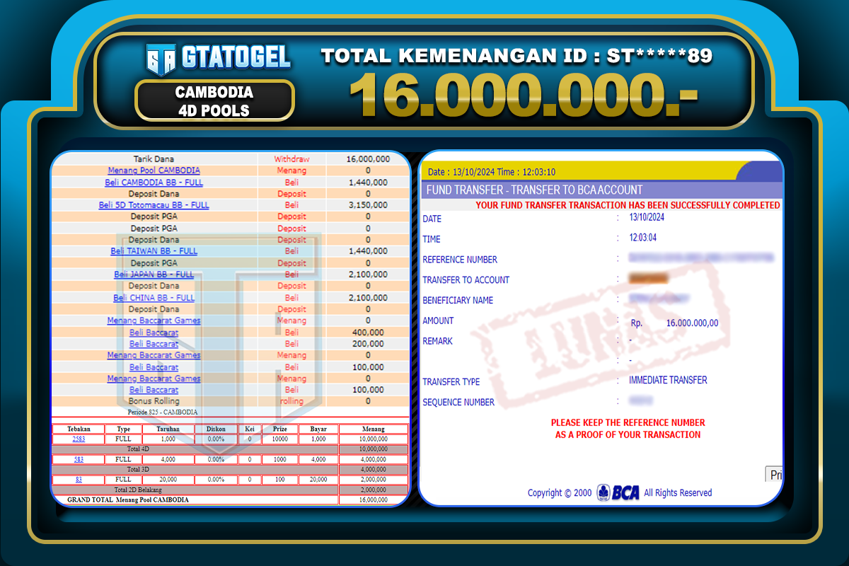 GTATOGEL – BUKTI WITHDRAW KEMENANGAN JP CAMBODIA 4D POOLS Rp.16.000.000,- DI BAYAR LUNAS !!!