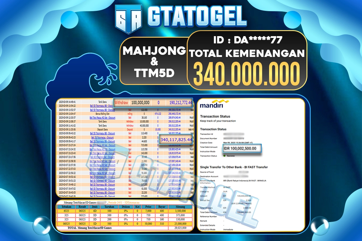 GTATOGEL – BUKTI WITHDRAW KEMENANGAN JACKPOT MAHJONG WAYS Rp.340.000.000,- DI BAYAR LUNAS !!!