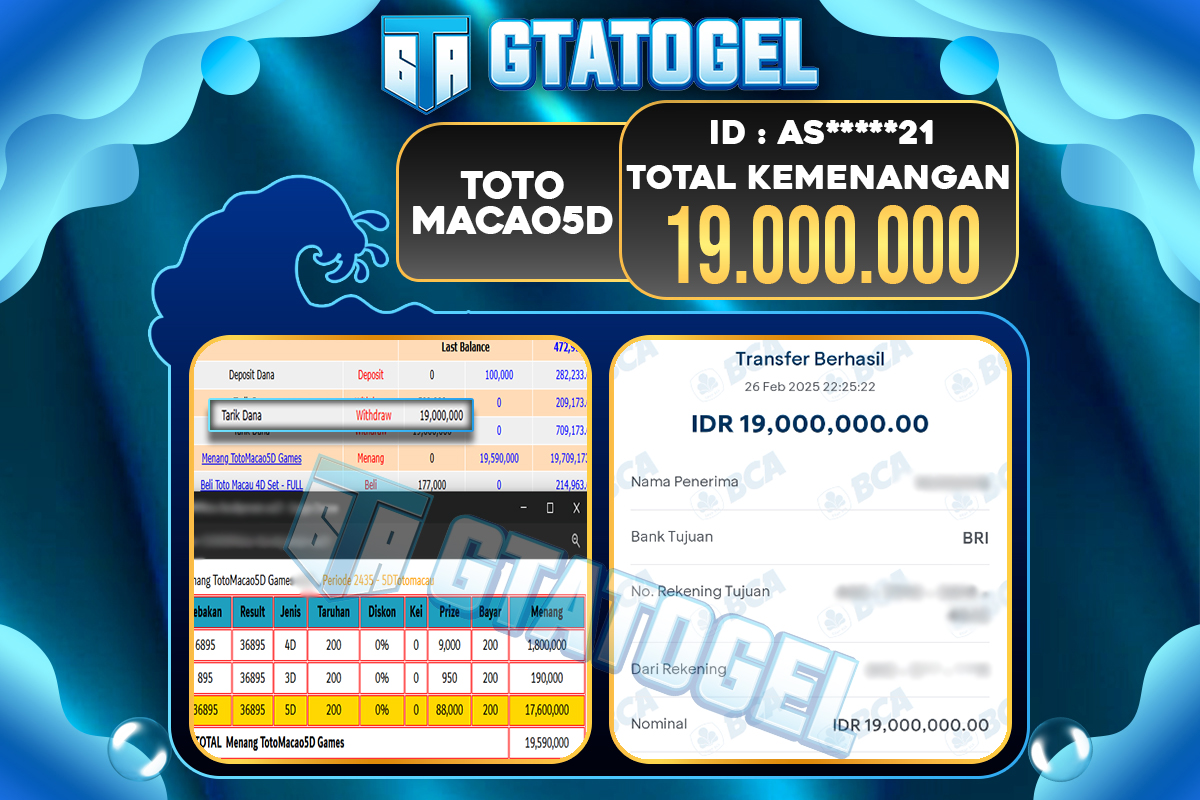 GTATOGEL – BUKTI WITHDRAW KEMENANGAN JP TOTOMACAU 5D Rp.19.000.000,- DI BAYAR LUNAS !!!