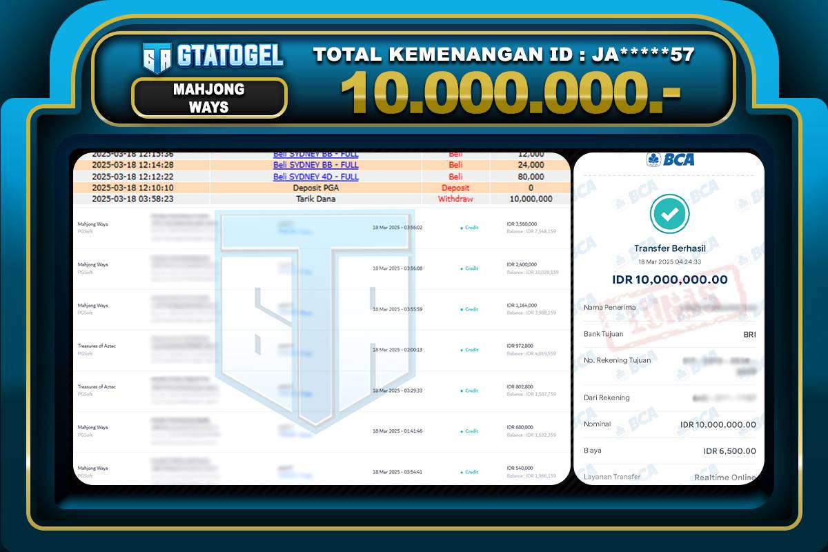 GTATOGEL – BUKTI WITHDRAW KEMENANGAN JP MAHJONG WAYS Rp.10.000.000,- DI BAYAR LUNAS !!!