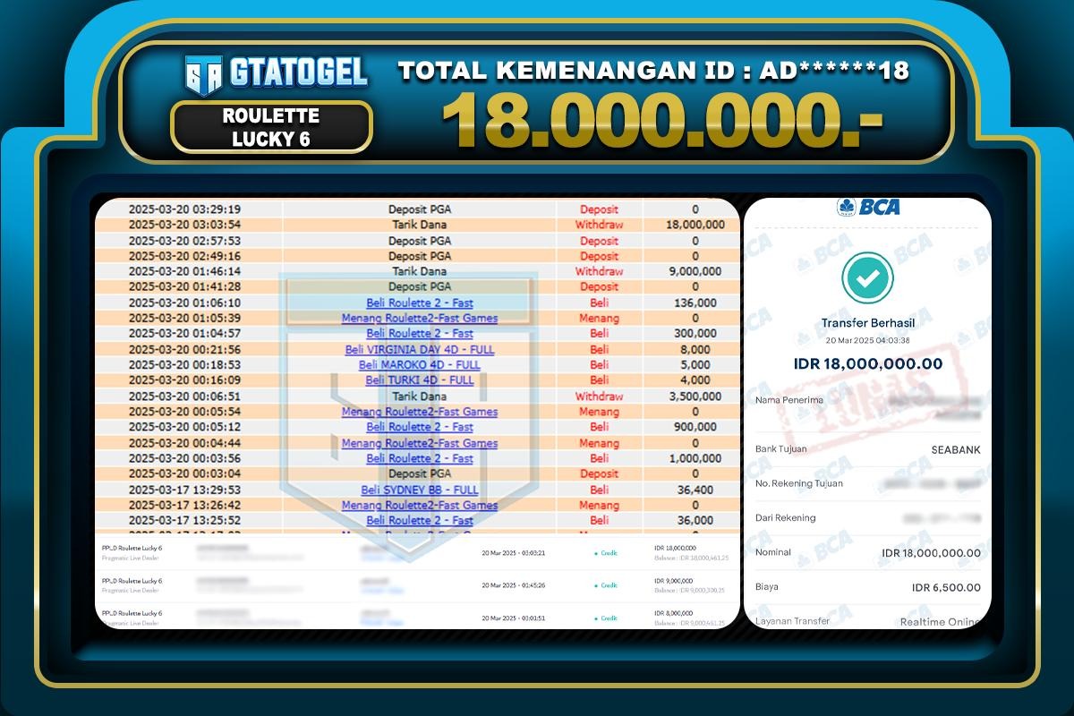 GTATOGEL – BUKTI WITHDRAW KEMENANGAN JP ROULETTE LUCKY 6 Rp18.000.000,- DI BAYAR LUNAS !!!