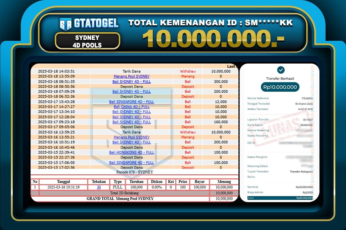GTATOGEL – BUKTI WITHDRAW KEMENANGAN JP SYDNEY 4D POOLS Rp.10.000.000,- DI BAYAR LUNAS !!!