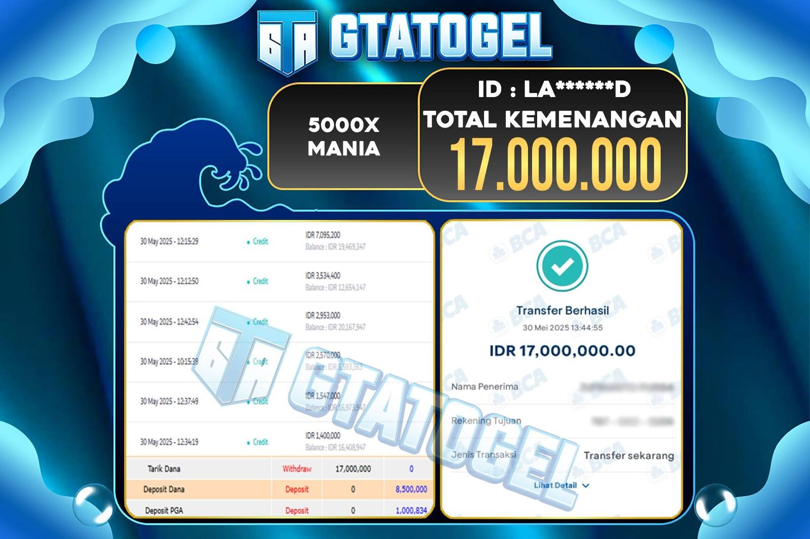 GTATOGEL – BUKTI WITHDRAW KEMENANGAN JACKPOT 5.000X MANIA Rp.17.000.000,- DI BAYAR LUNAS !!!