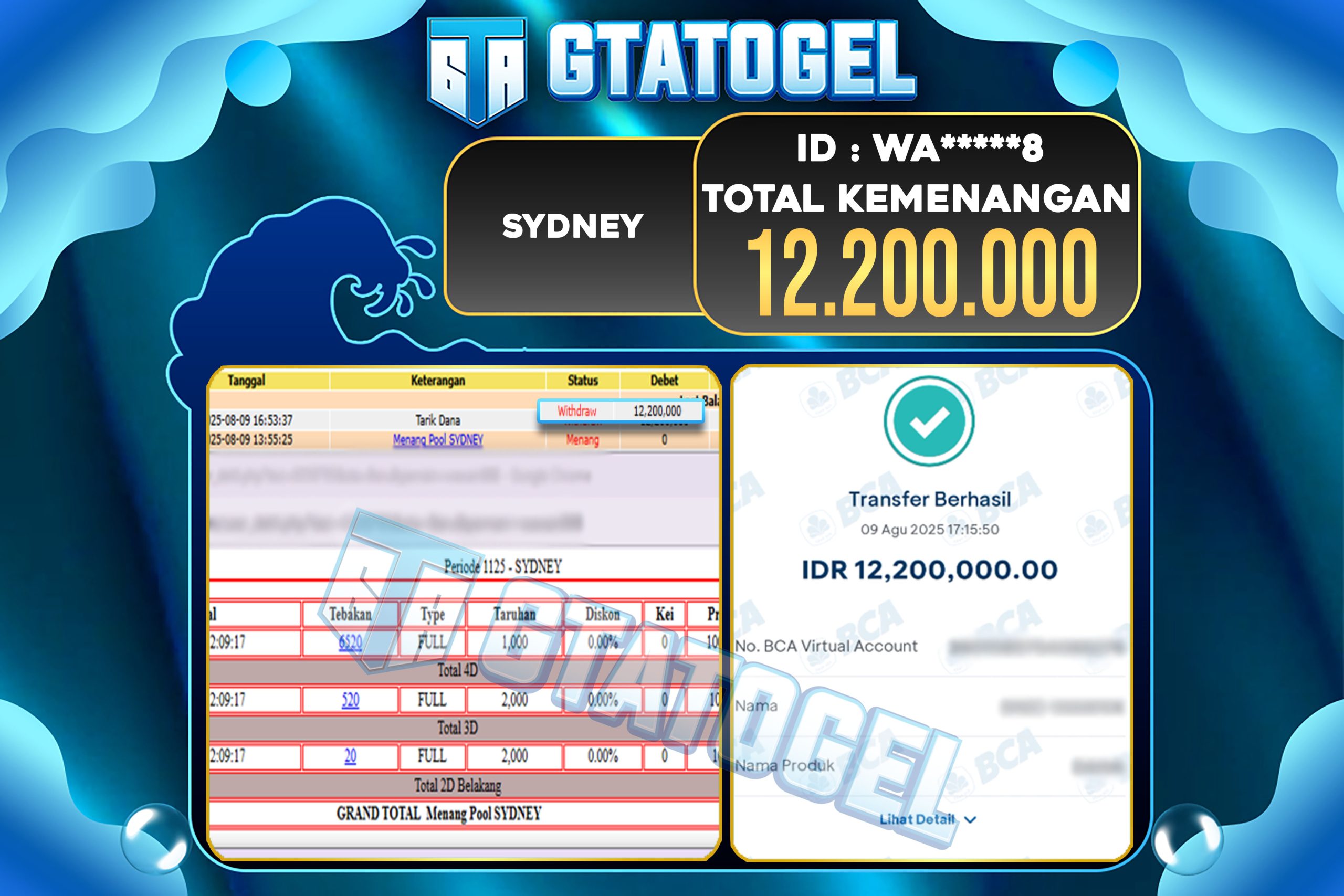 GTATOGEL – BUKTI WITHDRAW KEMENANGAN JP SYDNEY Rp.12.200.000,- DI BAYAR LUNAS !!!